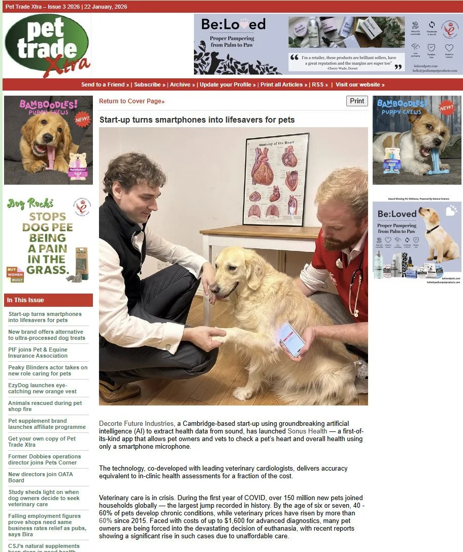 Launch of Sonus Health by Decorte Future Industries covered in trade magazines 21 Jan Written By Dr R P-J E Decorte Pet Gazette: https://www.petgazette.biz/229645-cambridge-startup-launches-app-to-monitor-pet-heart-health/ Pet Trade Extra: https://pettradextra.newsweaver.com/Newsletter/f14amqb6bre?lang=en&a=2&p=13853745&t=1952643 Ask Animal Web: https://askanimalweb.com/cambridge-startup-launches-ai-powered-app-to-monitor-pet-heart-health/ Dr R P-J E Decorte